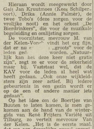 Destijds: 1967 De Boertjes van Buuten John Geerts, donderdag 12 maart 2026zondag 5 april 2026 In 1967 vond een fotosessie plaats in de studio van de Tilburgse fotograaf Frans van Aarle. Deze opname toont het orkest ‘De Boertjes van Buuten’, gekleed in traditionele klederdracht. Het gezelschap is afgebeeld met diverse instrumenten, waaronder een accordeon, trompet en drums.Een muzikaal en komisch gezelschapArtikel uit de Stem: 18 september 1971De Boertjes van Buuten begonnen hun carrière onder de naam ‘De Bietenbouwers’. Het betrof hier een ensemble van professionele musici onder de muzikale leiding van Jo Budie. De naamswijziging vond plaats na het vertrek van Ger de Roos bij de KRO, waarna de groep uitgroeide tot het vaste huisorkest van deze omroep.Hun landelijke bekendheid kregen ze vooral in de jaren ’60 en vroege jaren ’70. ‘De laatsten borduurden voor een deel voort op de populariteit (en het pseudodialect) van Jan van Riemsdijk,’ aldus de overlevering. Tussen 1966 en 1972 vormden ze het muzikale hart van het KRO-televisieprogramma Mik. Daarnaast kregen ze de rol van vast huisorkest in het welbekende radioprogramma Van twaalf tot twee.De gezichten achter de typetjes De kracht van het ensemble lag in de combinatie van muziek en humoristische typetjes, waarmee ze ‘het boerenleven met humor en warmte tot leven brachten, geliefd bij een breed publiek’.Op de foto zien we enkele van de meest prominente leden uit die tijd. Als tweede van links staat Annie Palmen, in de rol van ‘de pittige Drika, met haar typische no-nonsense uitstraling.’ Zij was de opvolgster van zangeres Annie de Reuver, die de rol eerder vertolkte. Rechts naast haar zien we radiocoryfee Kees Schilperoort als de ‘verstrooide, maar charmante Gait Jan Kruutmoes.’Andere vaste waarden in de televisie-uitzendingen waren Henk Jansen van Galen als Lubbert van Gortel en de ‘imitator in vaste dienst’ Bertus Bolknak (een pseudoniem van Henk van Wijk). Nadat Jansen van Galen in maart 1970 overleed, nam Ab Hofstee zijn plek in als Boer Voorthuizen.Hoewel hun optredens op de radio wel eens werden vergeleken met latere producties zoals de in de Achterhoek gesitueerde tv-serie De Woeste Grond, stonden de Boertjes van Buuten toch echt op zichzelf door hun specifieke “humoristische kijk op het landelijke Nederland.” De bezetting werd soms nog verder uitgebreid voor live-evenementen; zo noemde De Stem in 1970 naast Gait Jan en Drika ook nog ‘de twee Tobo’s’ voor de komische noot, en de begeleiding van het orkest onder de naam van ‘De Bierdrinkers’.Omdat Frans van Aarle vaker voor impresariaat Variété werkte, legde hij vermoedelijk ook deze foto vast. De eigenaar van het bureau, René Frijters, had destijds de Boertjes van Buuten in zijn artiestenstal opgenomen.Gerelateerde berichten:Destijds: 1967 Bredaseweg en Sint Annakerk We zien hier een groepje mannen bezig het verplaatsen van...Destijds: 1930 Boerinnen met Poffer Een aantal boerinnen op een rijtje aan een Brabantse Koffietafel....Destijds: 1963 Spoorlaan Maart 1963, Spoorlaan. Weerspiegeling in de ramen. Het postkantoor aan...Destijds: 1998 MariVin aan de Piushaven Een lang vervlogen evenement in de Piushaven en georganiseerd voor...Destijds: 1962 Joannes van Oisterwijkstraat Een warme nazomerdag in de Besterd. Op de vierde september... Destijds... Annie PalmenBoertjes van BuutenDestijdsDrikaGait Jan KruutmoesJan van RiemsdijkJo BudieKees Schilperoort
