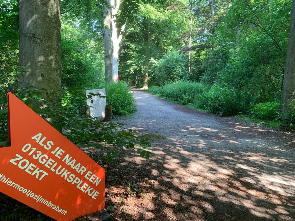 Gisteren was op de foto te zien dat de vakantie is begonnen, met een bijna leeg Koningsplein tijdens de zaterdagse markt. Er zijn veel marktkooplieden op vakantie. Net als klanten. Natuurlijk. Is jouw vakantieplek een geluksplekje? Dat hoop ik. Al die Tilburgers die thuisblijven, kunnen zich vermaken op 13 geluksplekjes. Hierboven zie je dat daar rode borden bij staan. Dit is een ingang van de Oude Warande. Ik memoreer nog maar eens de woorden van de in de Koestraat geboren schilder Kees Mandos, die zei: “As ge et hier niet ziet, ziedet daor ôk nie”.