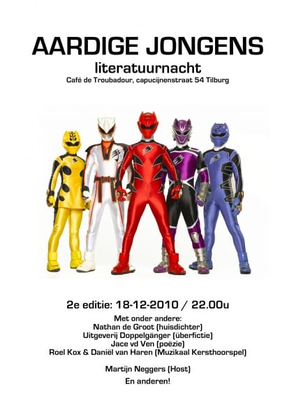 Literatuurnacht ‘Aardige Jongens’ met campusdichter Nathan de Groot Gastauteur, donderdag 16 december 2010zaterdag 1 februari 2014 Aanstaande zaterdag 18 december 2010 is het alweer de tweede literatuurnacht ‘Aardige Jongens’ die in café De Troubadour plaats vindt.Dit keer wordt er onder andere gedicht door dichters Jace vd Ven (oud stadsdichter) en de afzwaaiend campusdichter Nathan de Groot. Nathan neemt ook de, nog nooit eerder opgepakte, scepter van het huisdichterschap van café de troubadour op. Zonder handschoenen, dat is wel zo stoer natuurlijk. Omdat het de eerste keer is, leest hij uit zijn splinternieuwe studentendichtbundel “Kannen en Kruiken” voor.Ook Tilburgs fenomeen “Uitgeverij Doppelgänger” zal zijn opwachting maken. Überfictie is het sleutelwoord. Neerlandicus en TV-Persoonlijkheid Bas Jongenelen zal vertellen over Tilburg Absurdistan, bijzondere gezinnen uit Woensel, Schotse Rockmuziek en Brabantse gezegden. Één ding: niets is op waarheid gebaseerd. Überfictie dus. U kunt het, zo u wil, zien als een Kahunaburger. The big one.Tiny vd Binnenbandt heeft een Kerstverhaal geschreven en dit samen met muzikant Daniël van Haren tot een waar hoorspel gesmeed. Acteur en voormalig Powerstreler Roel Kox zal verteller zijn in het muzikale livehoorspel “Alweer een kerstverhaal met Jezus erin”, er moet natuurlijk wel een kleine verwijzing zijn naar de aankomende kerstdagen.NIEUWS: Ook Jeroen Kant (songwriter) blijkt een aardige jongen te zijn. Deze ongeëvenaarde liedjesschrijver hangt zijn gitaar over zijn rug en komt vanuit Heesbeen naar Tilburg gefietst. Ik zeg: alles voor de kunst!op de tweede editie vanAARDIGE JONGENSps. Joop van Zijl en het ondersteunende symphonie-orkest die deze promotietekst ten gehore zouden brengen, zijn in het kader van de culturele kaalslag wegbezuinigd. Jawel dames en heren: ook hier slaat de hamer van de crisis!Uw host: Martijn Neggers.Geen gerelateerde berichten. Evenement Gastbijdrage Aardige JongensBas JongenelenCampusdichterDaniël van HarenJace van de VenJeroen KantMartijn NeggersNathan de Groot