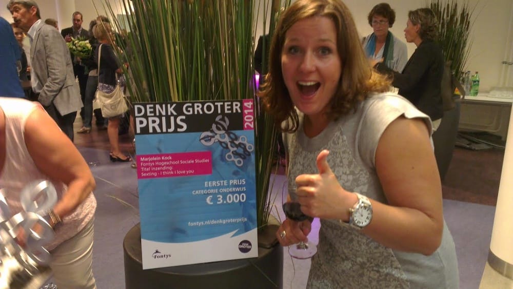 Marjolein Kock wint de Fontys Denk Groter Prijs Roland Samuëls, woensdag 3 september 2014woensdag 3 september 2014 Marjolein Kock, student aan Fontys Hogeschool Sociale Studies en medewerker van Kompaan en De Bocht, heeft de Denk Groter Prijs van Fontys gewonnen in de categorie Onderwijs studenten met haar project Sexting – I think I love you. Het project moet jongeren bewust maken van de risico’s van het online verspreiden van seksueel getinte foto’s.Marjolein Kock onderzocht een preventieve werkwijze gericht op het vergroten van de seksuele en relationele weerbaarheid van jongeren. Zij toont volgens de jury lef, daadkracht en doorzettingsvermogen in wat ze doet. Uit het juryrapport: “Marjolein heeft zichzelf opgeworpen als projectleider hetgeen in dit geval bijzonder knap is omdat zij, zelf student, voor de doelgroep gaat staan.” Parallel aan haar onderzoek ontwikkelde zij samen met jongeren een campagne over sexting. De campagne wordt dit najaar groots gelanceerd in Tilburg en omgeving, in samenwerking met de gemeente. Met haar authentieke aanpak bewijst ze, volgens de jury van de Denk Groter Prijs, de samenleving een grote dienst.Sexting is het verzenden en ontvangen van seksueel getinte beelden of tekstberichten met een mobiele telefoon of via internetapplicaties zoals WhatsApp, Ping, Tinder, Facebook, YouTube, Snapchat, Skype, Instagram en Twitter. Het kan dus een seksueel getint bericht, foto of video zijn die sexy of (deels) naakt is. In de media gaat het vaak over hoe sexting uit de hand kan lopen. Van (cyber)pesten tot chantage, ernstig persoonlijk leed, schooluitval, schaamte, problemen bij het vinden van een baan, angst, onzekerheid en in sommige gevallen neiging tot zelfdoding. Sexting is onuitwisbaar.Om problemen te voorkomen is het belangrijk dat jongeren de risico’s kennen en aan de bel trekken als er misbruik in het spel komt. De campagne is daarom gericht op bewustwording en het vergroten van de seksuele en relationele weerbaarheid van jongeren. Jongeren weten zelf prima hoe je zo’n boodschap effectief over kunt brengen en de changemakers van WE CAN Young Tilburg zijn bezig om een campagne te ontwikkelen die op 17 november van start gaat.Het project sexting is een initiatief van Kompaan en De Bocht en het Steunpunt Huiselijk Geweld Midden-Brabant. Zij zetten zich in met workshops op scholen om jongeren weerbaar en bewust te maken en bieden hulpverlening als er problemen zijn. Op 17 november gaat de website www.onuitwisbaar.nu on line.De Denk Groter Prijs is bedoeld voor alle medewerkers en studenten van Fontys Hogescholen die een mooie prestatie hebben geleverd tijdens hun studie, in hun werk of voor hun promotie. Naast een geldbedrag (3000 euro voor de eerste prijs) bestaat de prijs uit een trofee, gemaakt door beeldend kunstenaar en docent aan Fontys Hogeschool voor de Kunsten, Ton van der Vleuten.Geen gerelateerde berichten. Onderwijs Zorg Denk Groter PrijsFacebookFontys HogescholenInstagramKompaan en De BochtMarjolein KockPingSexting – I think I love youSkypeSnapchatSteunpunt Huiselijk Geweld Midden-BrabantTinderWhatsAppYoutube