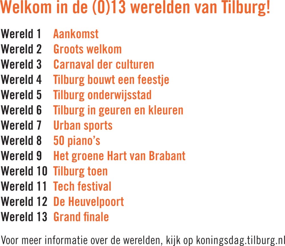 Welkom in de wereld van Tilburg. Op 27 april 2017 viert de koninklijke familie Koningsdag in onze stad. Het gezelschap legt een route af langs 13 programma-onderdelen of werelden. Elke wereld vertelt een stukje van het verhaal van Tilburg.