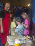 Stadsimker slingert eerste lindebloesemhoning John Geerts, zondag 12 juli 2015 Stadsimker Marcel Horck slingerde vandaag op de Heuvel de allereerste lindebloesemhoning van dit jaar. Tevens demonstreerde hij aan alle belangstellende hoe het slingeren van honing in zijn werk gaat.De stadsimker heeft zo’n 150 bijenkasten in Tilburg staan, waaronder bij de Stadstuinderij de Piushaven. Hij heeft er meerdere soorten bijenkasten opgesteld, waaronder een zeer zeldzame holle boomstam.Uitleg: Om de verzamelde honing te kunnen winnen wordt de honing geslingerd. Slingeren is het centrifugeren van de honingraten in een daarvoor bestemde slinger. Eerst worden de honingbakken van de bijenkasten afgehaald (hierin bevinden zich wel honingraten maar geen bijen meer). Vervolgens worden de raten met de hand ontdaan van hun wasdekseltjes waarmee de bijen de honing hebben verzegeld. Daarna gaan de raten in de centrifuge die met de hand aangeslingerd wordt. De honing loopt zo uit de raten en wordt dan via een zeef opgevangen in een groot vat. Vanuit deze vaten worden later de potjes met honig gevuld. De leeggeslingerde ramen worden weer terug geplaatst in de bijenvolken zodat zij opnieuw gevuld kunnen worden. Geen gerelateerde berichten. Economie Evenement honingLindebloesemMarcel HorckSlingerenstadsimkerStadsimker TilburgTilburg