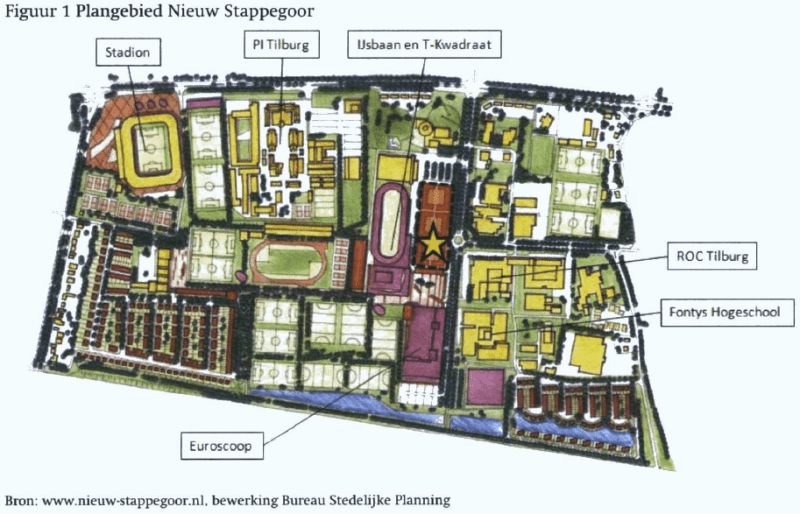 Nieuw Stappegoor: De XL-supermarkt is gedacht op het braak liggende veld vóór de Euroscoop en T-Kwadraat (Ster op de kaart)